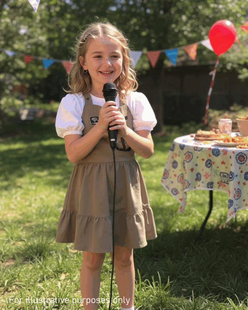 She pretended to check a genuine microphone by tapping one of the toy microphones on the table. Then she spoke.