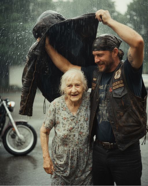 He pulled up beside me—tattoos, leather vest, bandana, the whole thing. Not the type my son would approve of. He just looked at me for a second, then swung off his jacket and held it over my head like a makeshift umbrella.