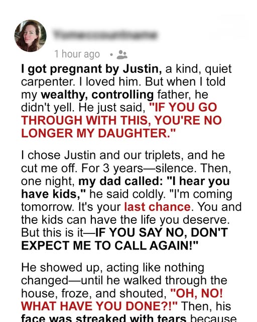 I chose Justin and our triplets, and he cut me off. For 3 years—silence. Then, one night, my dad called: “I hear you have kids,” he said coldly. “I’m coming tomorrow. It’s your last chance. You and the kids can have the life you deserve. But this is it—IF YOU SAY NO, DON’T EXPECT ME TO CALL AGAIN!”