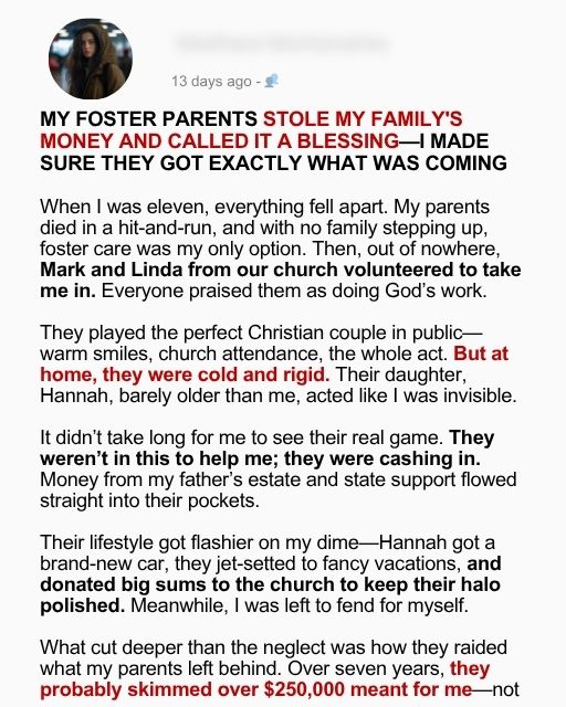 By then, I had learned to keep my head down and survive. School was my escape, and part-time jobs helped me buy what I needed without relying on them. But I was quietly planning. I knew I couldn’t take them on head-to-head; they controlled everything, even the story about me at church. To everyone else, I was their “troubled foster kid,” always needing their guidance. Behind closed doors, they drained me dry.