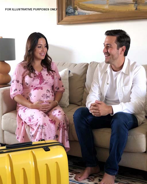 The woman stood slightly behind him, one hand resting protectively over her stomach.