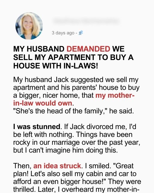 It all started with a seemingly innocent suggestion. My husband, Jack, sat me down one evening with that familiar charming smile of his. “Honey,” he began, “I’ve been thinking. Why don’t we sell your apartment and my parents’ house? We could pool the money and buy a bigger, better home—one that my mother can own. She’s the head of the family, after all. It just makes sense.”