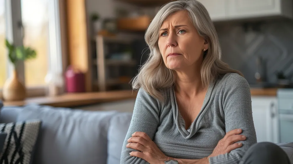 A woman sitting on a couch and frowning | Source: Midjourney