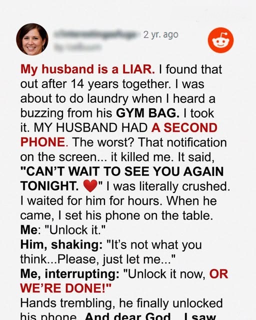 My husband is a LIAR. I found that out after 14 years together. I was about to do laundry when I heard a buzzing from his GYM BAG. I took it. MY HUSBAND HAD A SECOND PHONE. The worst? That notification on the screen… it killed me. It said, “CAN’T WAIT TO SEE YOU AGAIN TONIGHT.”