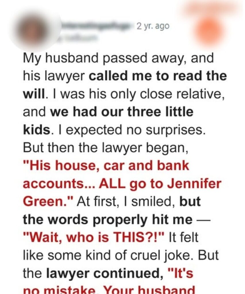 But the lawyer continued, “It’s no mistake. Your husband specifically named Jennifer Green as the beneficiary for these assets.”