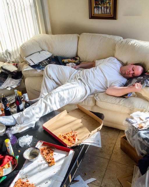 Tuesday morning came, and Mark was already in his sweatpants on the couch, remote in hand, looking completely relaxed.