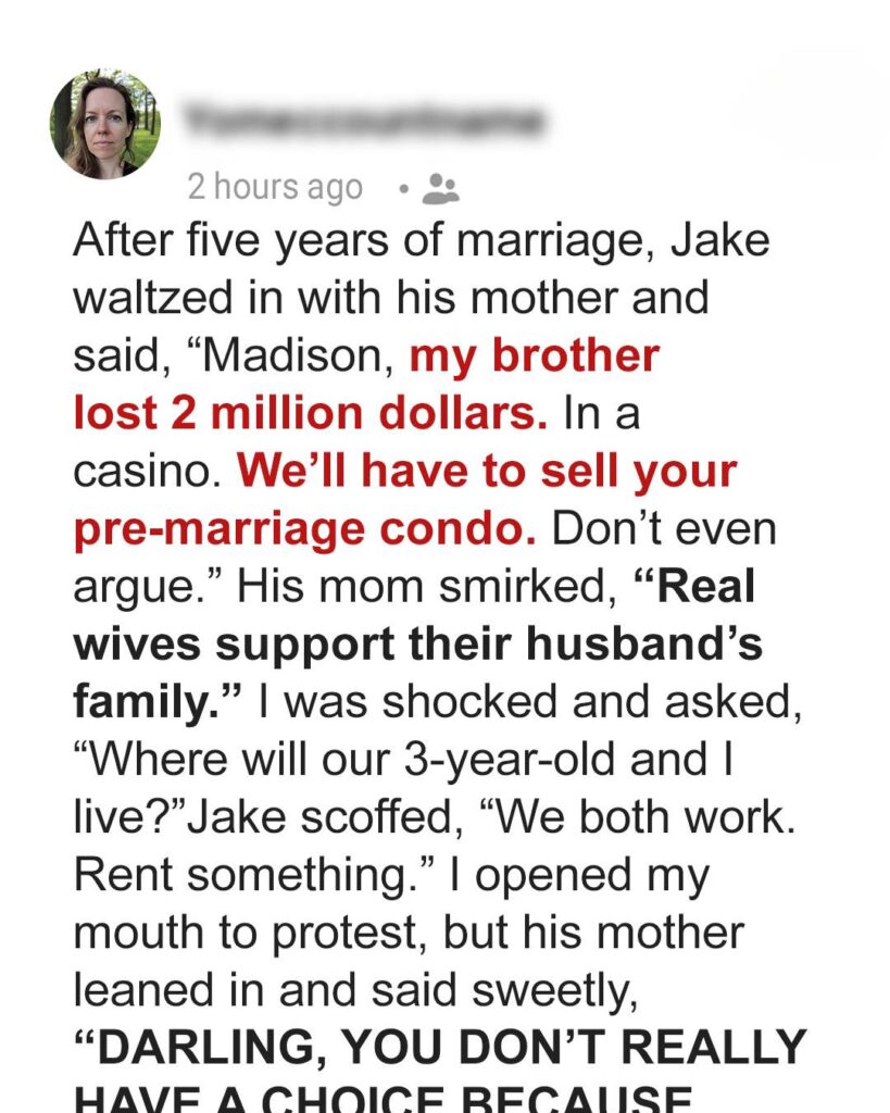 “Sell your condo, Maddie. Family takes care of family,” Patricia said.“Darling, you don’t really have a choice.” That condo wasn’t just property. I’d bought it before marriage. It was my daughter Kelly’s stability and future. And they wanted me to hand it over to cover Max’s mistakes..