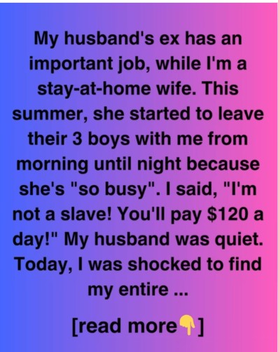While I am a stay-at-home wife, my husband’s ex-wife has a position that is quite significant. This past summer, she began to leave their three sons with me from the time they woke up until the time they went to bed because she is “so busy.” My response was, “I am not a slave!” You’ll pay $120 a day!” My spouse could not be heard. When I arrived home today, I was astonished to see that my whole kitchen had been wrecked, that my favorite mug had been smashed, and that one of the boys had used a permanent marker to paint all over the wall in my living room.