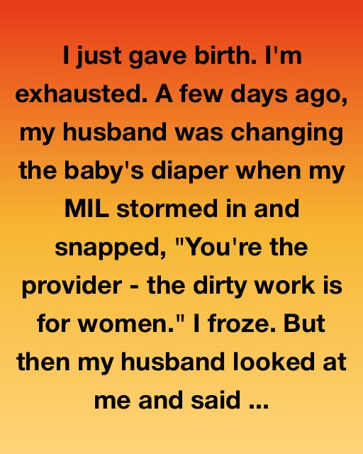 It made me smile despite my fatigue.Suddenly, the sound of a door opening echoed down the hall. It was Alex’s mother, Linda, who had decided to “drop by” unannounced. She walked into the nursery and, upon seeing Alex changing the baby, her face tightened.“You shouldn’t be doing that,” she said sharply. “You’re the provider. The hard work, like this, is for women.”Her words cut through the air like ice. I froze on the couch, unsure of what to say. My heart sank, afraid Alex might feel pressured to agree with her outdated beliefs.But Alex didn’t flinch. He finished securing the diaper and then turned to his mother calmly.