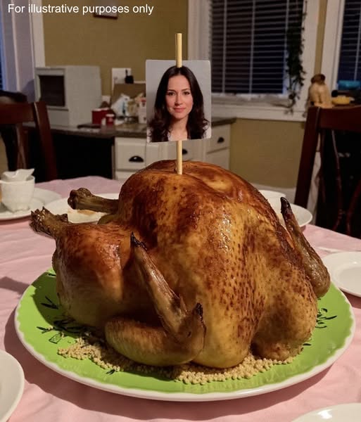 Her perfectly roasted turkey had a laminated photo of my face pinned right to the breast.