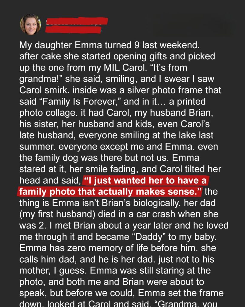 For Emma’s ninth birthday, we hosted a backyard party filled with balloons, cake, and laughter. Everything was perfect until Emma opened a gift from Carol. Inside was a beautiful silver frame engraved with “Family Is Forever.” When Emma pulled back the cover, her smile faded. The collage inside showed everyone in Brian’s family except Emma and me. The message was painfully clear.