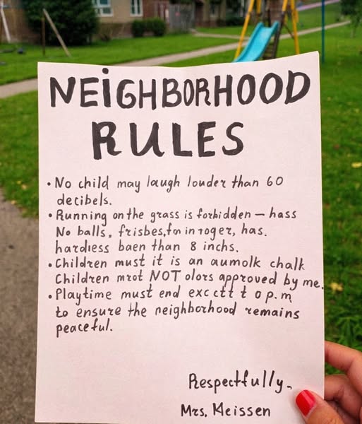 I cracked my knuckles and typed up my own “Neighborhood Rules.” But mine weren’t just absurd—they were so outrageous that anyone with half a brain would see them as the brilliant mockery they were.