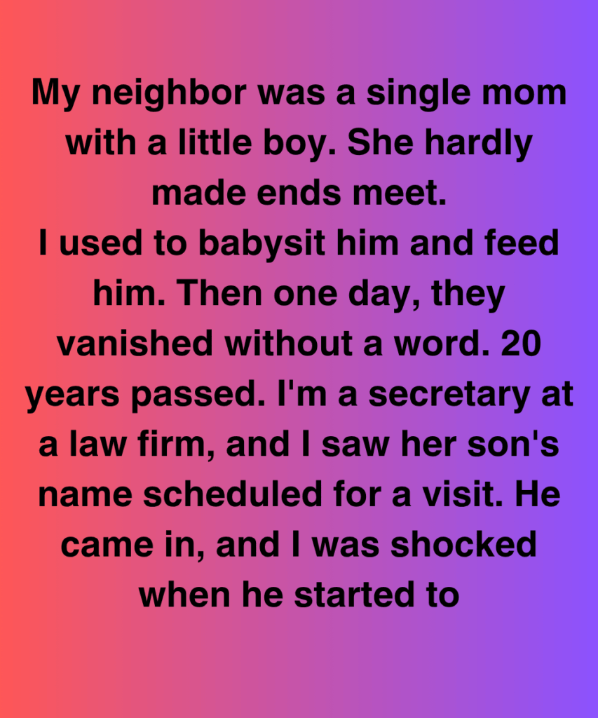 20 years passed. I’m a secretary at a law firm, and I saw her son’s name scheduled for a visit. He came in, and I was shocked when he started to speak—with this calm, low voice and confident posture that didn’t match the shy kid I remembered.