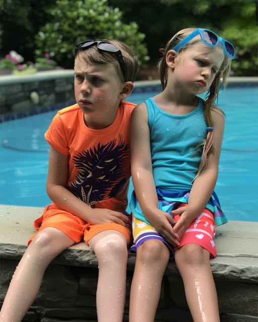 Ava and Lily fell into the pool, arms flailing, eyes wide with shock.