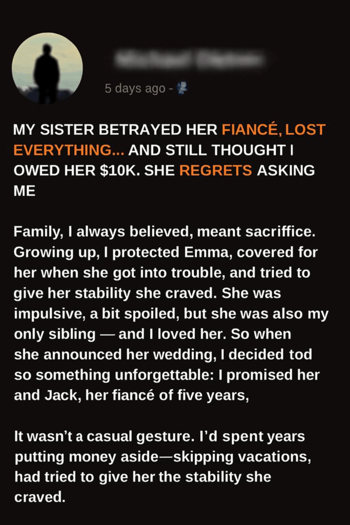 Family, I always believed, meant sacrifice. Growing up, I protected Emma, covered for her when she got into trouble, and tried to give her the stability she craved. She was impulsive, a bit spoiled, but she was also my only sibling — and I loved her. So when she announced her wedding, I decided to do something unforgettable: I promised her and Jack, her fiancé of five years, $10,000 to start their life together.