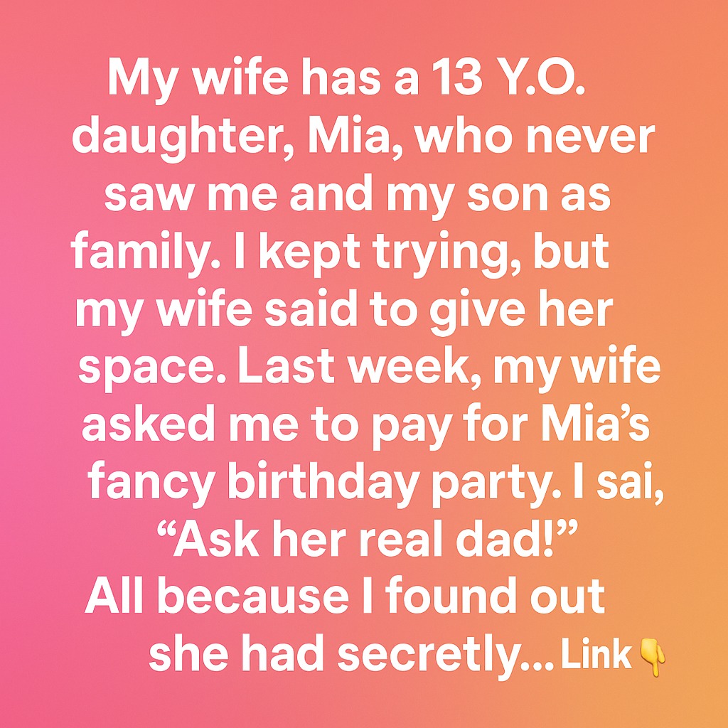 My wife has a 13-year-old daughter, Mia, who never saw me and my son as family. I kept trying, but my wife always told me to give her space. Last week, my wife asked me to pay for Mia’s fancy birthday party. I said, “Ask her real dad!”All because I found out she had secretly been saving messages from him—grand promises of expensive gifts and trips, none of which ever happened.