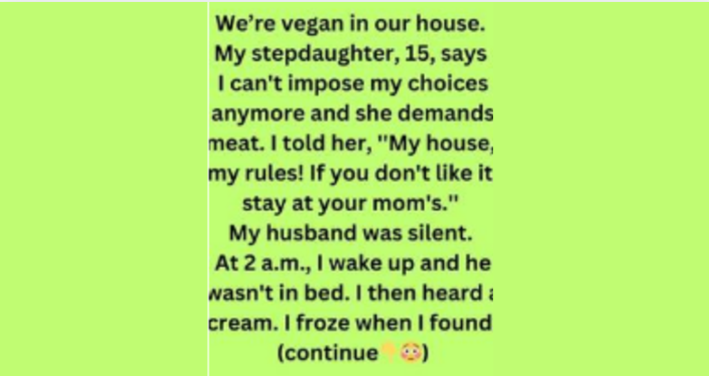 In blended families, even minor disagreements can quickly grow into significant conflicts. For a woman named Nadia, a request to uphold her vegan lifestyle within her home sparked an unexpected and intense reaction. Her stepdaughter’s startling response left her feeling distressed, furious, and having no idea what to do. The woman turned to us for support in navigating this delicate situation.