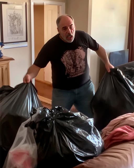 I turned the corner, and there he was—stuffing her favorite dresses, dresses she’d worn on vacations, birthdays, even my graduation—into black trash bags like they were garbage! And my mother was on the couch, eyes on the floor, hands folded tightly in her lap!