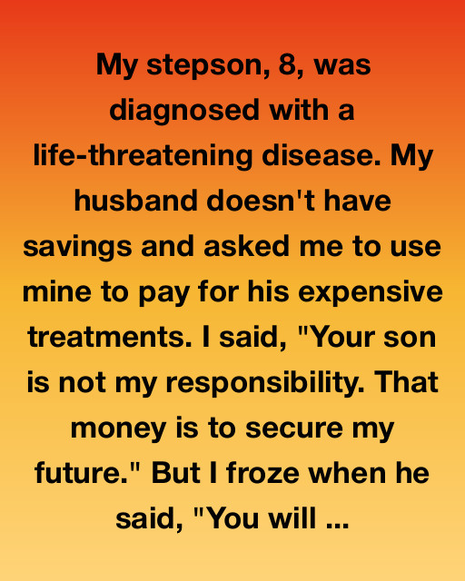 My stepson, 8, was diagnosed with a life-threatening disease. My husband doesn’t have savings and asked me to use mine to pay for his expensive treatments. I said, “Your son is not my responsibility. That money is to secure my future.” But I froze when he said, “You will never have a future worth living if you let a child die when you could’ve saved him.”