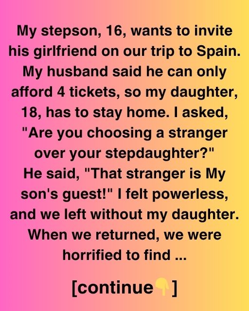 My 16-year-old stepson wants to take his girlfriend to Spain. My 18-year-old daughter must stay home since my husband can only afford 4 tickets. “Are you choosing a stranger over your stepdaughter?” He said, “That stranger is my son’s guest!” I felt helpless and left my daughter.