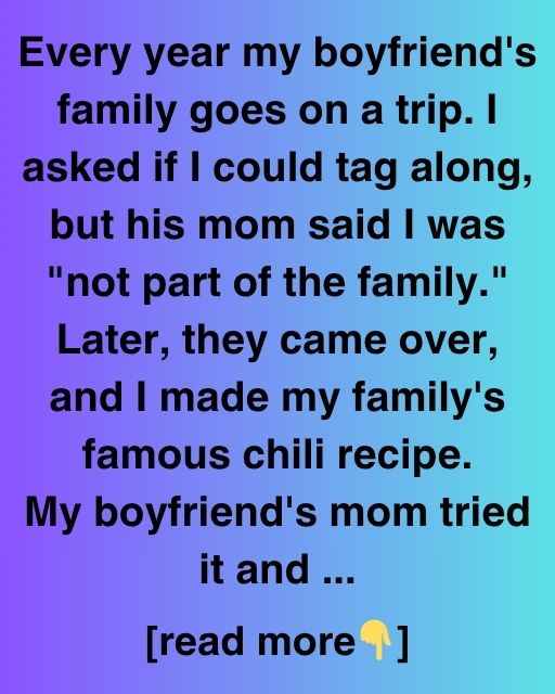 Every year, my boyfriend’s family vacations. I offered to join, but his mom stated I was “not part of the family.” Later, they came over and I made my family’s famous chili. My boyfriend’s mom’s eyes brightened up as she tried it. She requested seconds.