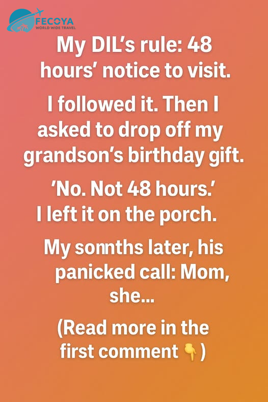 My daughter-in-law had one rule — 48 hours’ notice before visiting. I respected that, even though it sometimes stung. When my grandson’s birthday came around, I simply asked if I could drop off his gift. She reminded me of the rule again, so I quietly placed the wrapped present on their porch, smiled at the security camera, and drove home. I promised myself I would never let pride get in the way of loving my family — even from a distance.