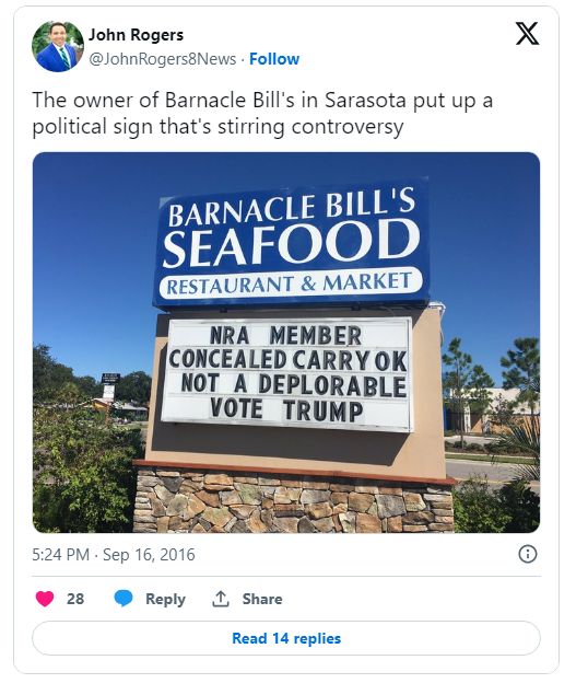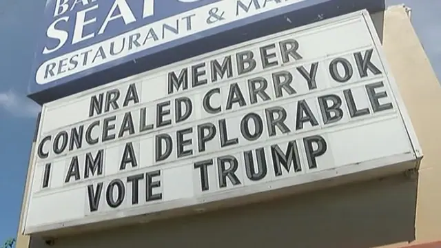 A Florida seafood restaurant owner was so fed up with what he’d seen that he got off the fence for the first time to share exactly how he felt by posting four blunt phrases on the sign outside his business.Best restaurants near me
