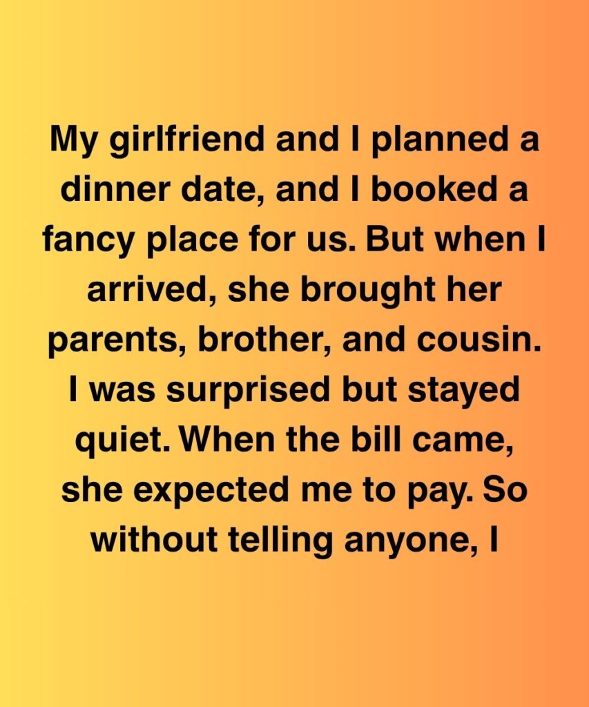 My girlfriend and I planned a dinner date, and I booked a fancy place for us. But when I arrived, she brought her parents, brother, and cousin. I was surprised but stayed quiet. When the bill came, she expected me to pay. So without telling anyone, I stood up, smiled, said I needed to use the restroom—and walked out.