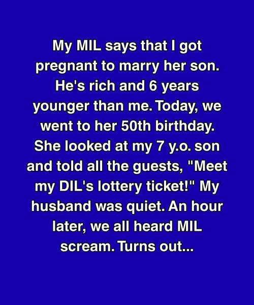 “My MIL says that I got pregnant to marry her son. He’s rich and 6 years younger than me. Today, we went to her 50th birthday. She looked at my 7 y.o. son and told all the guests, ‘Meet my DIL’s lottery ticket!’ My husband was quiet. An hour later, we all heard MIL scream. Turns out…”