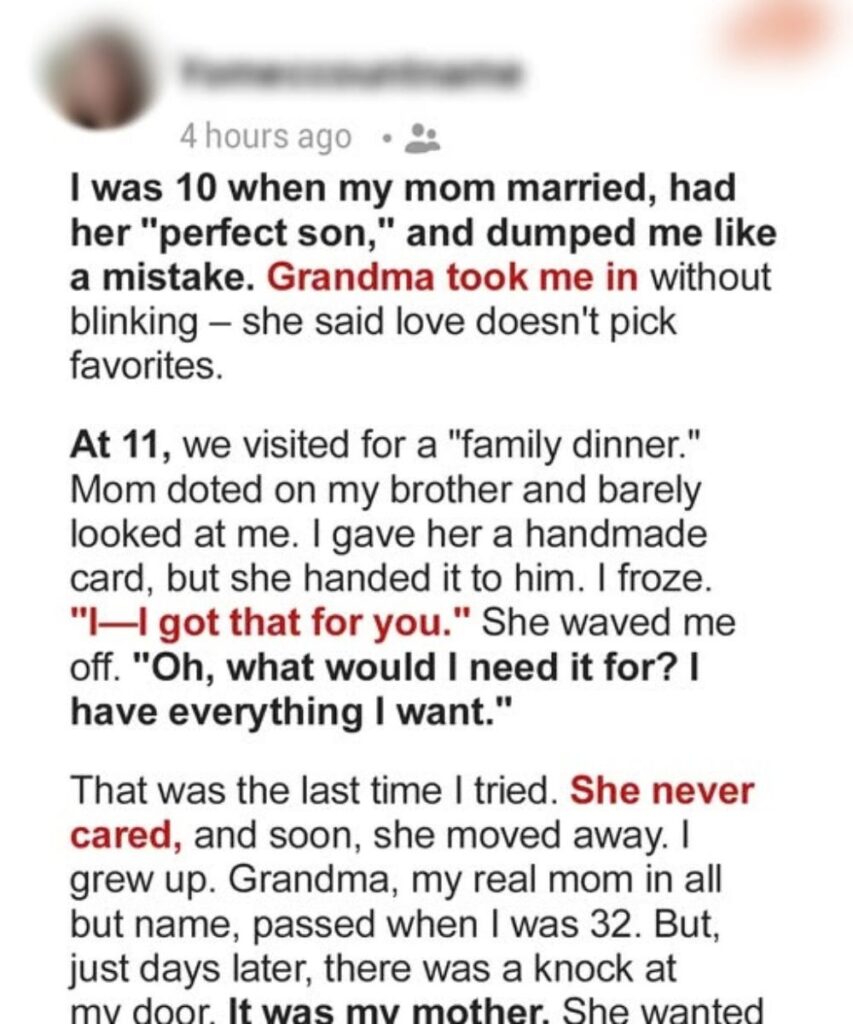 I was 10 when my mom married, had her “perfect son,” and dumped me like a mistake. Grandma took me in without blinking – she said love doesn’t pick favorites. At 11, we visited for a “family dinner.” Mom doted on my brother and barely looked at me. I gave her a handmade card, but she handed it to him. I froze. “I-I got that for you.” She waved me off. “Oh, what would I need it for? I have everything I want.” That was the last time I tried. She never cared, and soon, she moved away. I grew up. Grandma, my real mom in all but name, passed when I was 32. But, just days later, there was a knock at my door. It was my mother. She wanted to talk.