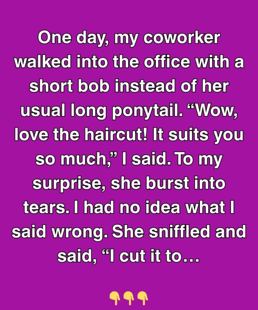 One day, my coworker walked into the office with a short bob instead of her usual long ponytail. “Wow, love the haircut! It suits you so much,” I said. To my surprise, she burst into tears. I had no idea what I said wrong. She sniffled and said, “I cut it to feel worthy of someone who didn’t even notice.”