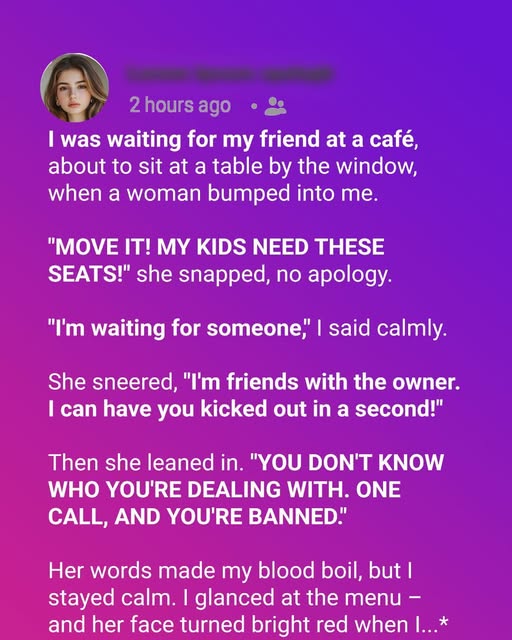 I was waiting for my friend at a cafe, about to sit at a table by the window, when a woman bumped into me. “MOVE IT! MY KIDS NEED THESE SEATS!” she snapped, no apology.”I’m waiting for someone,” I said calmly. She sneered, “I’m friends with the owner. I can have you kicked out in a second!”