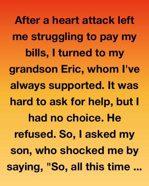 After a heart attack left me struggling to pay my bills, I turned to my grandson Eric, whom I’ve always supported. It was hard to ask for help, but I had no choice. He refused. So, I asked my son, who shocked me by saying, “So, all this time you never really trusted me, and now you need me?”