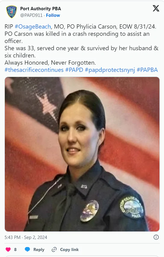 Officer Phylicia Carson was a dedicated member of the Osage Beach Police Department, having joined in June 2023. Her fellow officers, friends, and family are shattered by this unimaginable loss. She leaves behind her loving husband, Grant Carson, and their six children, who now face the difficult task of carrying on without her.