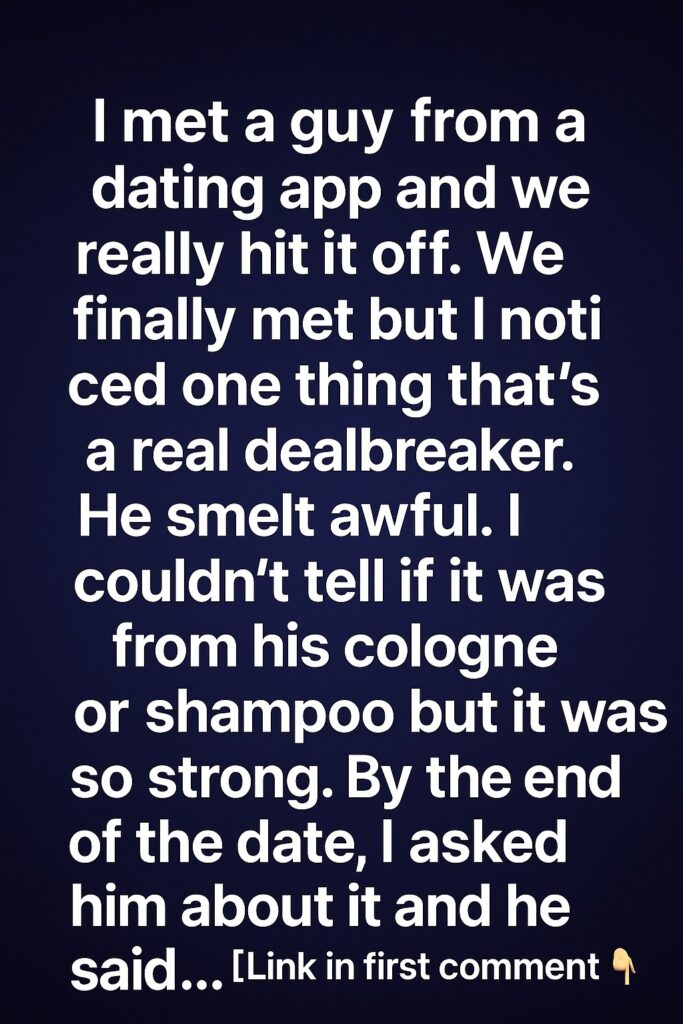 I met a guy on a dating app, and to my surprise, we really hit it off during our chats. We had similar humor, good conversations, and he seemed genuine. After weeks of texting, we decided to finally meet in person.When the day came, I was excited but also nervous. The moment I saw him, he looked exactly like his pictures—friendly smile, nice outfit, and polite manner. But almost immediately, I noticed something that caught me off guard: his scent was overwhelming.