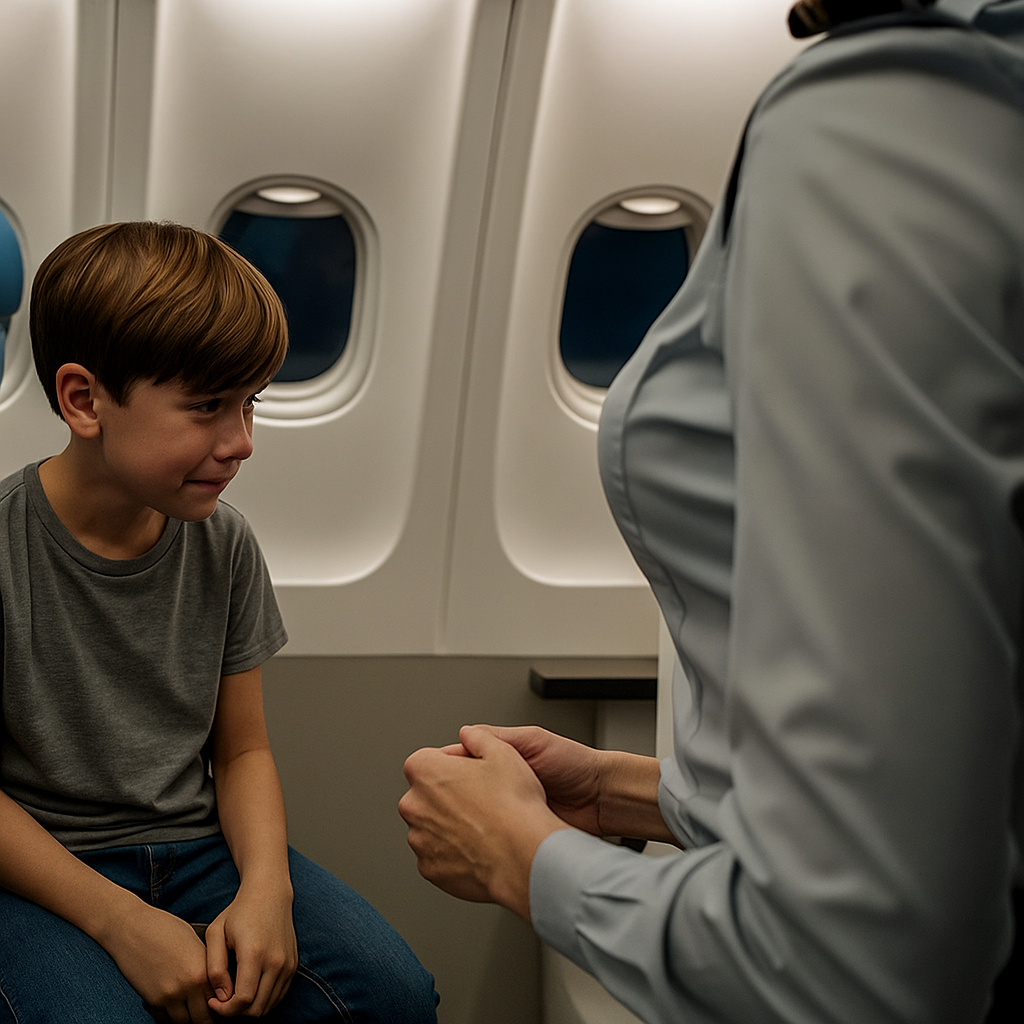 When Ben’s grandma was sick, the family visited her in Seattle and brought her medication. Ben was separated from his family at the airport. After seeing his mother again, he followed her onboard the aircraft.