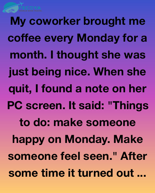 My coworker brought me coffee every Monday for a month. I thought she was just being nice. When she quit, I found a note on her PC screen. It said: “Things to do: make someone happy on Monday. Make someone feel seen.” After some time it turned out that simple gesture had started something I never expected.