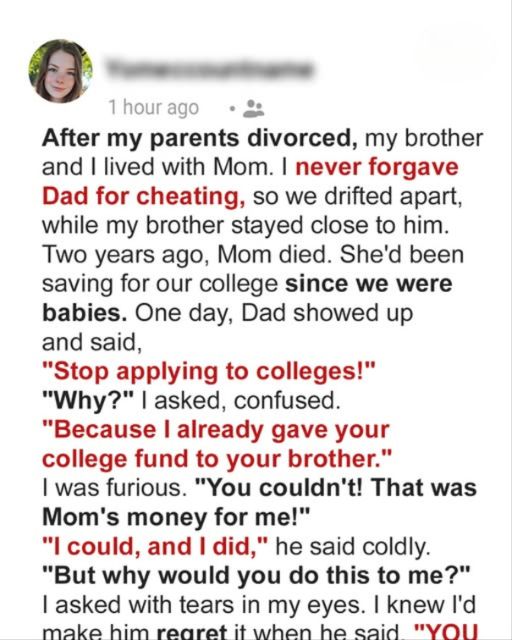 My brother and I lived with Mom after my parents divorced. I never forgave Dad for infidelity, so we drifted apart while my brother kept close. Two years ago, Mom died. Our mother saved for college since we were babies. Dad visited and said, “Stop applying to colleges!”
