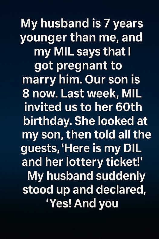 My husband is 7 years younger than me, and my MIL says that I got pregnant to marry him. Our son is 8 now. Last week, MIL invited us to her 60th birthday. She looked at my son, then told all the guests, “Here is my DIL and her lottery ticket!” My husband suddenly stood up and declared, “Yes! And you—”