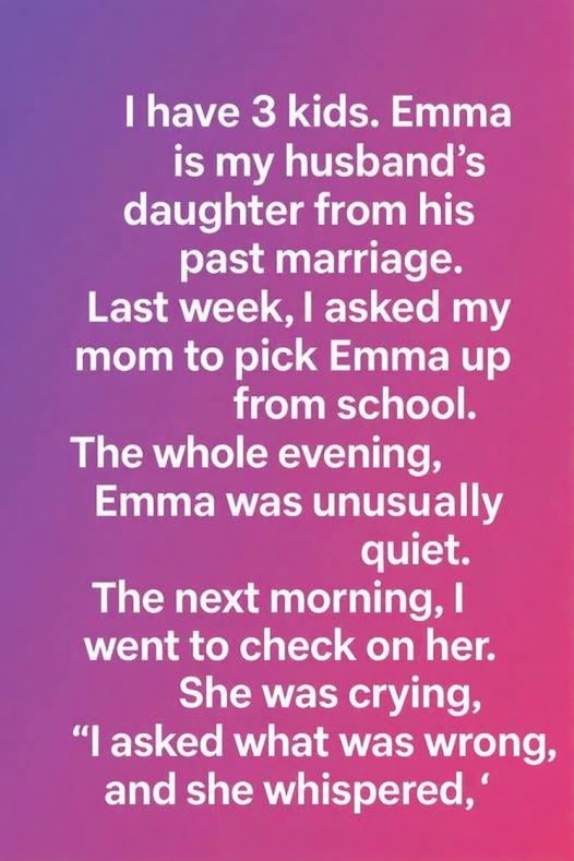I have 3 kids. Emma is my husband’s daughter from his past marriage. Last week, I asked my mom to pick Emma up from school. The whole evening, Emma was unusually quiet. The next morning, I went to check on her. She was crying, and when I asked what was wrong, she whispered her fear of not belonging.