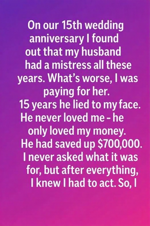 On our 15th wedding anniversary, I discovered a truth that shattered everything I thought I knew. For all those years, my husband had been secretly supporting another woman—and without realizing it, I had been paying for every part of their hidden life. Fifteen years of smiles, conversations, and shared moments suddenly felt like a carefully constructed illusion. He hadn’t stayed for love; he had stayed for comfort, stability, and my financial support. And when I learned he had quietly saved $700,000, I realized just how long he had been preparing for a future that didn’t include me.