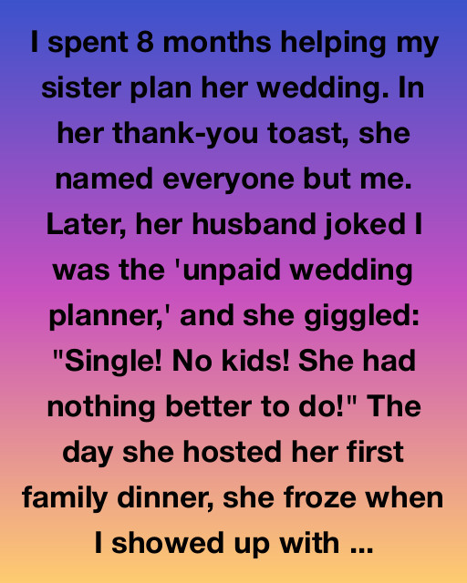 I spent 8 months helping my sister plan her wedding. In her thank-you toast, she named everyone but me. Later, her husband joked I was the “unpaid wedding planner,” and she giggled: “Single! No kids! She had nothing better to do!” The day she hosted her first family dinner, she froze when I showed up with someone she didn’t expect.