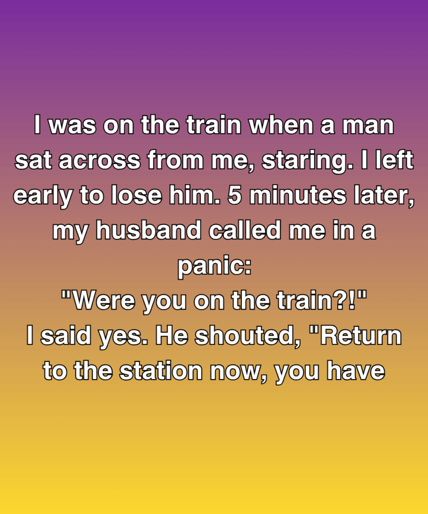 I was on the train when a man sat across from me, staring. I left early to lose him. Five minutes later, my husband called me in a panic: “Were you on the train?!” I said yes. He shouted, “Return to the station now, you have to find that man!” I froze. The urgency in his voice wasn’t like him—he’s usually calm, even when we’re late to things. I asked why, but he just kept saying, “Please, just go back!” I felt my skin prickling.