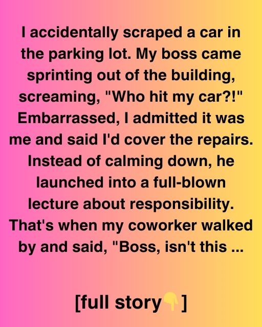 I accidentally scraped a car in the parking lot. My boss came sprinting out of the building, screaming, ‘Who hit my car?!’ Embarrassed, I admitted it was me and said I’d cover the repairs. Instead of calming down, he launched into a full-blown lecture about responsibility. That’s when my coworker walked by and said, “Boss, isn’t this your wife’s car?”