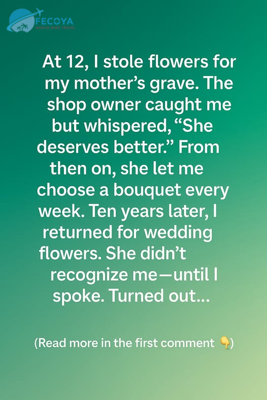 At 12, I stole flowers for my mother’s grave. I didn’t do it out of mischief—I just wanted something beautiful to place beside her headstone. My family had very little then, and grief felt heavier when all I had to offer were wildflowers I’d gathered from the roadside. That day, I slipped a small bouquet from the corner of a flower shop, thinking no one saw me. But as I turned to leave, the shop owner gently stopped me.
