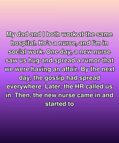 My dad and I both work at the same hospital. He’s a nurse, and I’m in social work. One day, a new nurse saw us hug and spread a rumor that we were having an affair. By the next day, the gossip had spread everywhere. Later, the HR called us in. Then, the new nurse came in and started to cry.