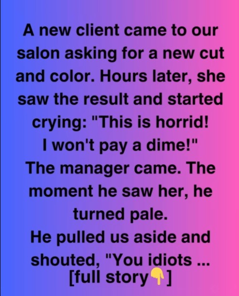 A new customer requested a cut and color at our salon. The effect hours later made her cry: “This is horrid!” No charge!” The manager arrived. He paled at her sight. He drew us away and said, “You idiots!”