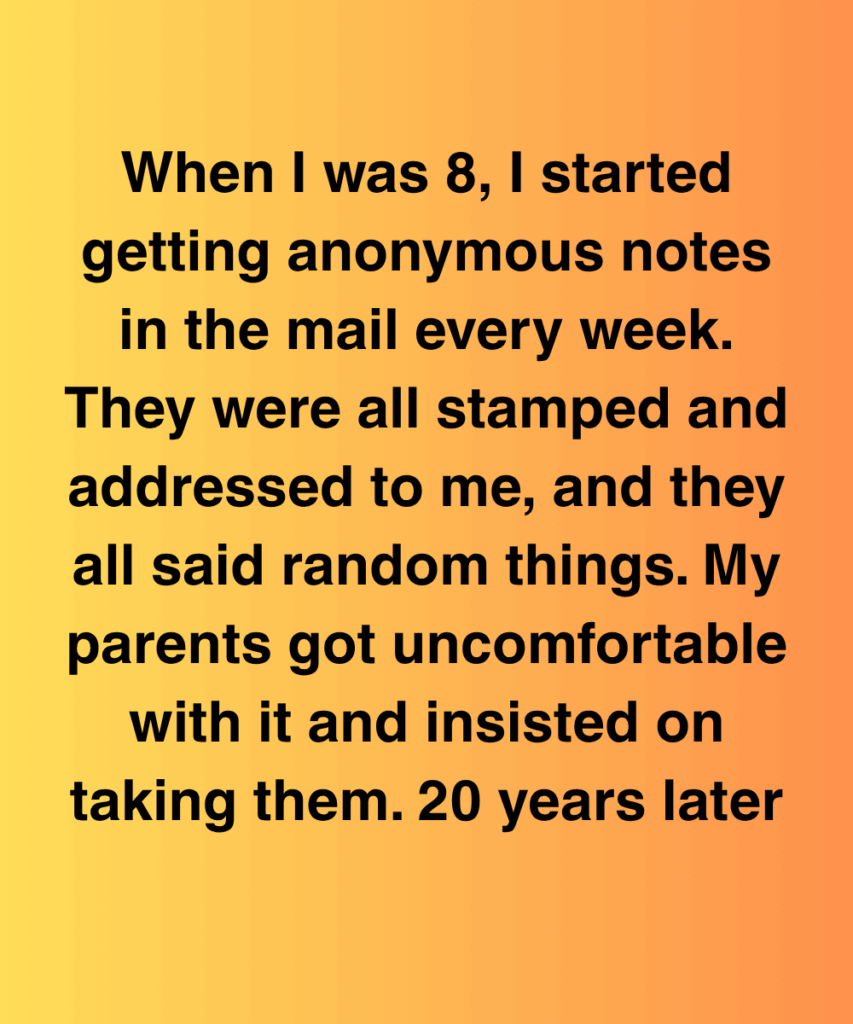 When I was 8, I started getting anonymous notes in the mail every week. They were all stamped and addressed to me, and they all said random things. My parents got uncomfortable with it and insisted on taking them.