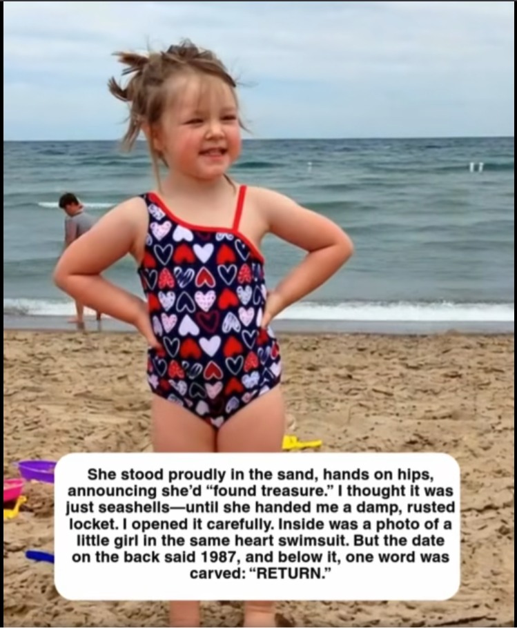 She stood proudly in the sand, hands on hips, announcing she’d “found treasure.” I thought it was just seashells—until she handed me a damp, rusted locket. I opened it carefully. Inside was a photo of a little girl in the same heart swimsuit. But the date on the back said 1987, and below it, one word was carved: “RETURN.”