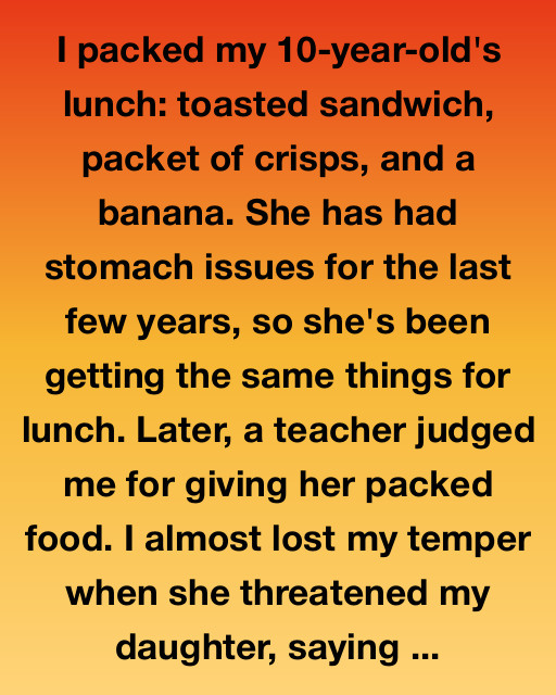 I packed my 10-year-old’s lunch: toasted sandwich, packet of crisps, and a banana. She has had stomach issues for the last few years, so she’s been getting the same things for lunch. Later, a teacher judged me for giving her packed food. I almost lost my temper when she threatened my daughter, saying she’d be forced to eat the school meals starting the next week—no exceptions.